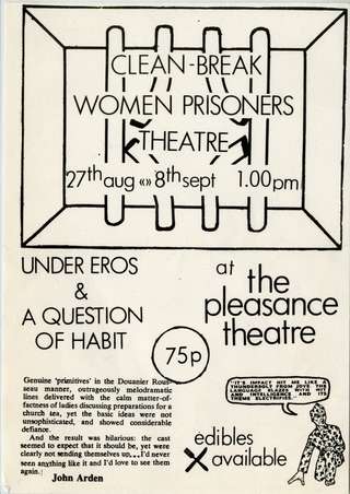 Clean Break began to perform openly as ex-prisoners. Their first tour of ‘A Question of Habit’ and ‘Under Eros’ by Jenny Hicks and Ros Davies to the Pleasance Theatre at the Edinburgh Fringe in August 1979 brought them recognition and success.